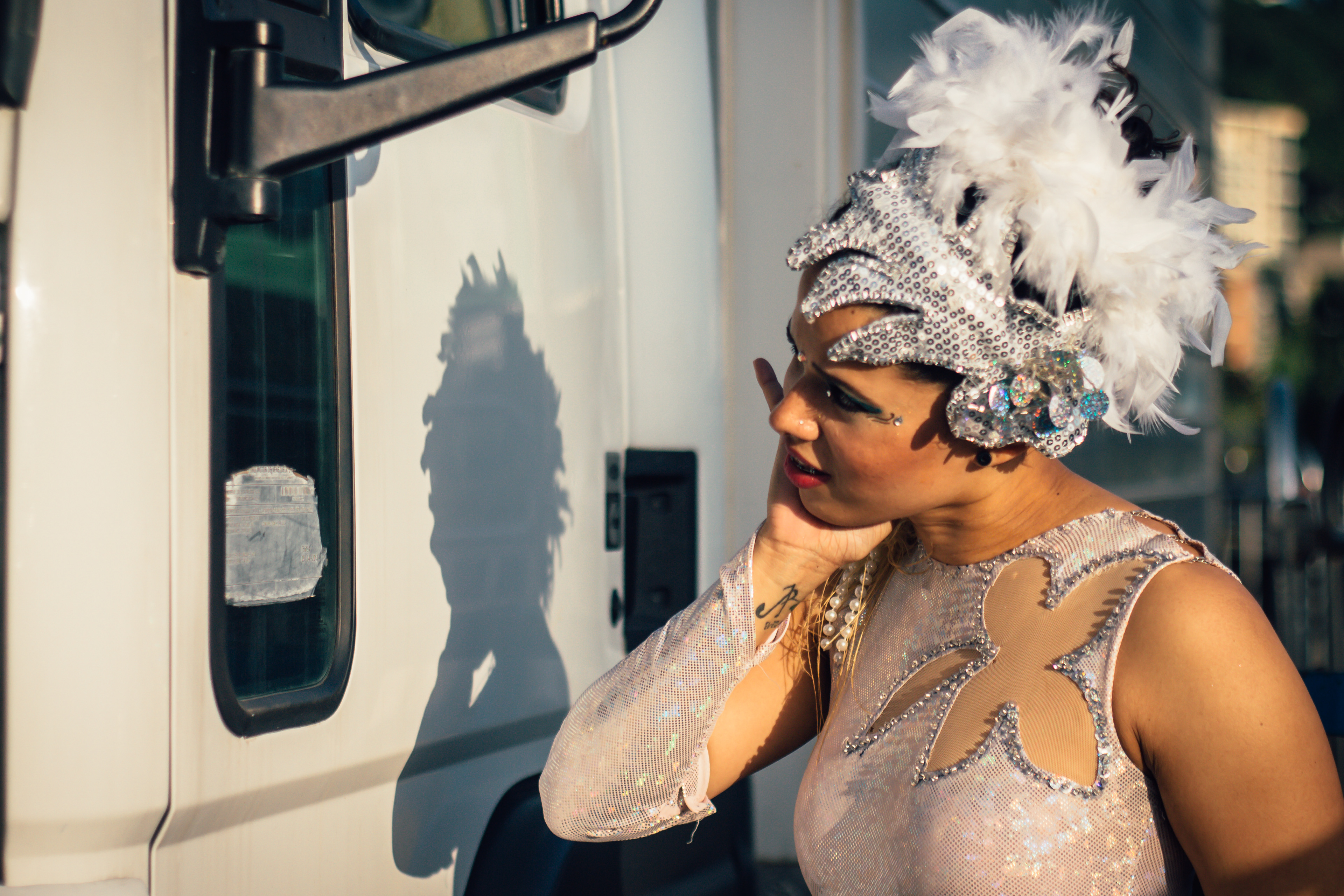 Dancer walking towards the stage for her number in the earlier show of the circus there are two shows a day. Caracas, 2015